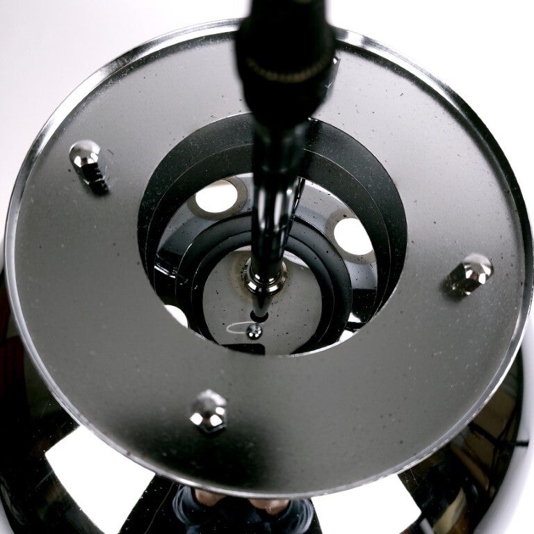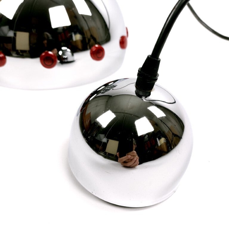 Coole space age hanglamp in chroom uit de jaren '70, waarschijnlijk van Massive. Knap kosmisch ontwerp in koepelvorm,afgewerkt met ronde chromen schijven erbovenop. De rode doppen in de koepel geven een heel leuk kleureffect. In excellente vintage staat, met lichte ouderdomssporen.