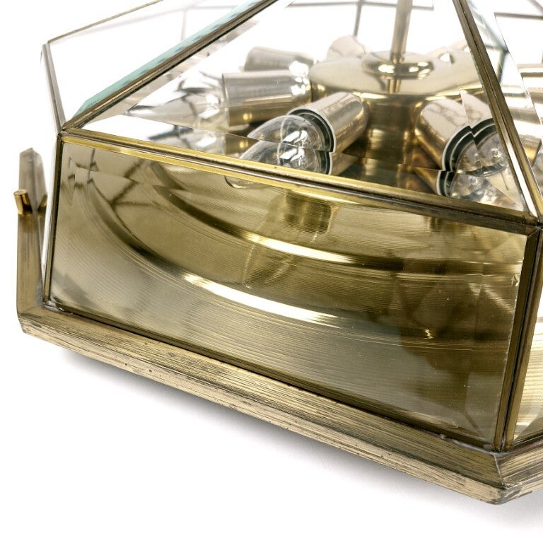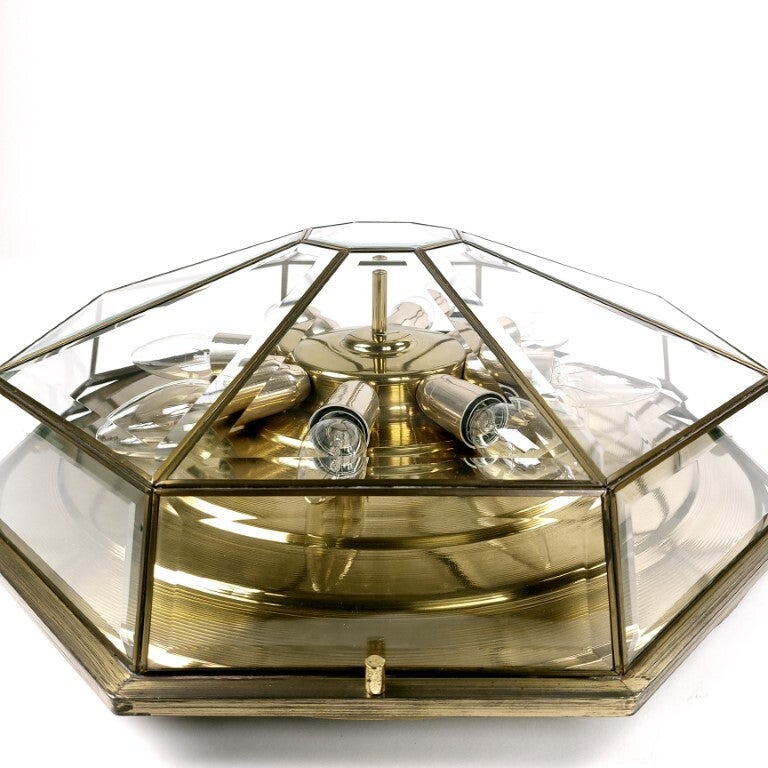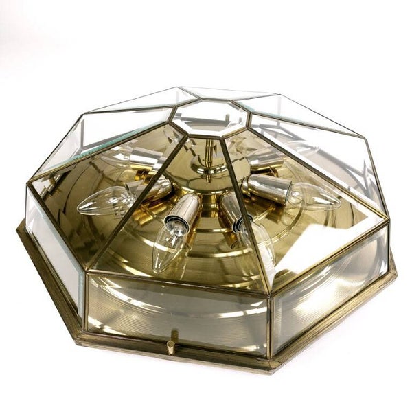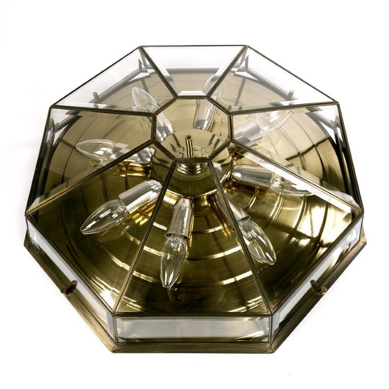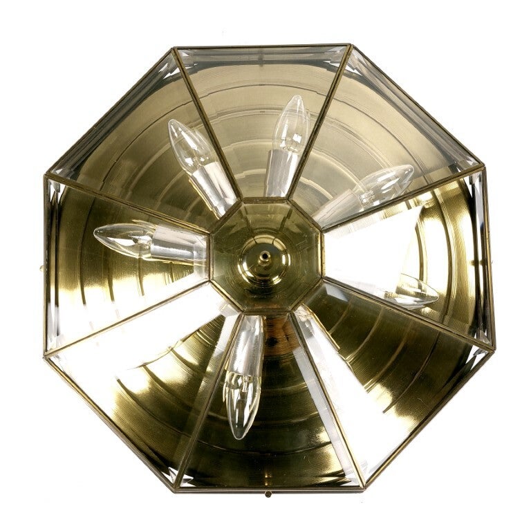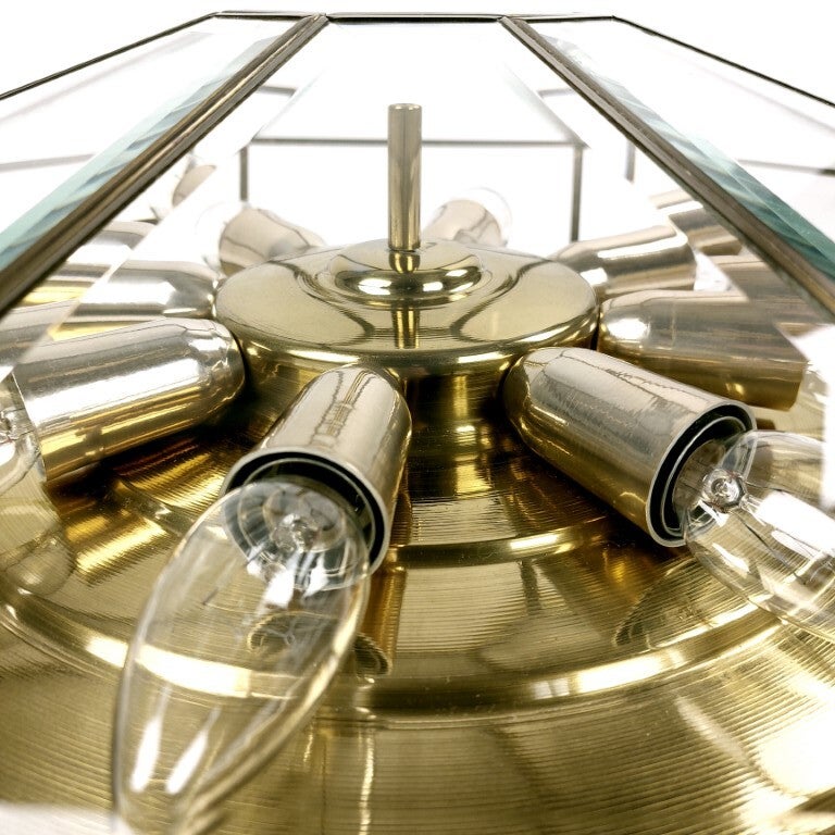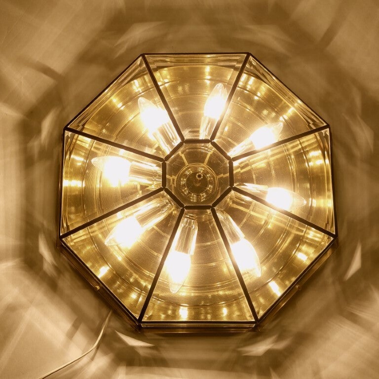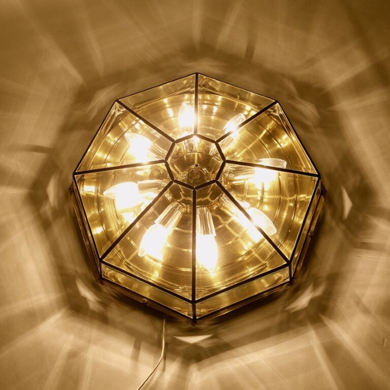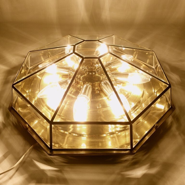 Prachtige octagonale plafondlamp in Hollywood Regency stijl van de Belgische Lustrerie Deknudt. Met z'n 8 lichtpunten en koepel in messing en geslepen glas verspreidt deze eyecatcher een magnifiek licht. Dit is de grootste versie van deze plafondlamp, en is voorzien van de originele merksticker en een ophanghaak. De lamp dateert uit de jaren '70 en is in zeer goede vintage staat, het messing heeft wat patina wat ze nog extra karakter geeft.
