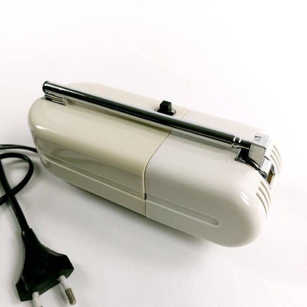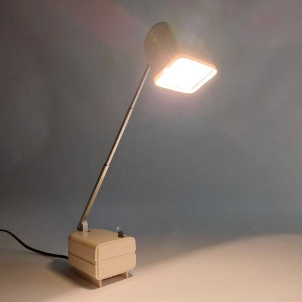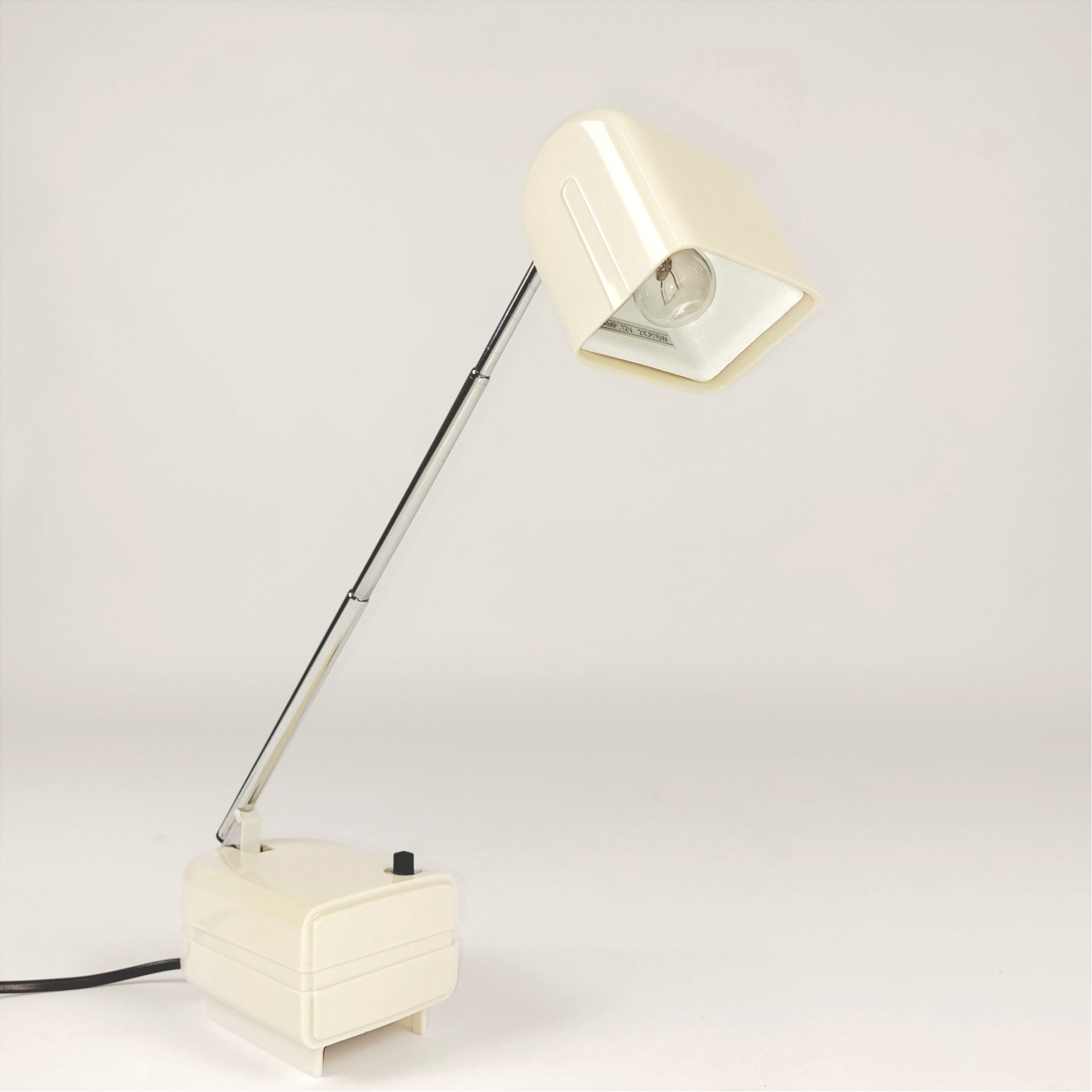 Telescopische bureaulamp van Fagerhults, genaamd 'Stella', geproduceerd in Hong Kong in de jaren '70. Knap ontwerp waarbij de lamp compact kan samengevouwd worden en zo handig mee te nemen is. De telescopische arm kan uitgetrokken worden tot een maximum hoogte van +/ 45cm, en kan ook op en neer bewegen. De lampenkap kan ook op en neer kantelen en ronddraaien. De lampsterkte kan op 2 standen gezet worden om de lichtintensiteit aan te passen. Er is ook mogelijkheid voorzien om de lamp aan een wand op te hangen. In heel goede vintage staat, er is enkel wat verkleuring op bepaalde oppervlakken.