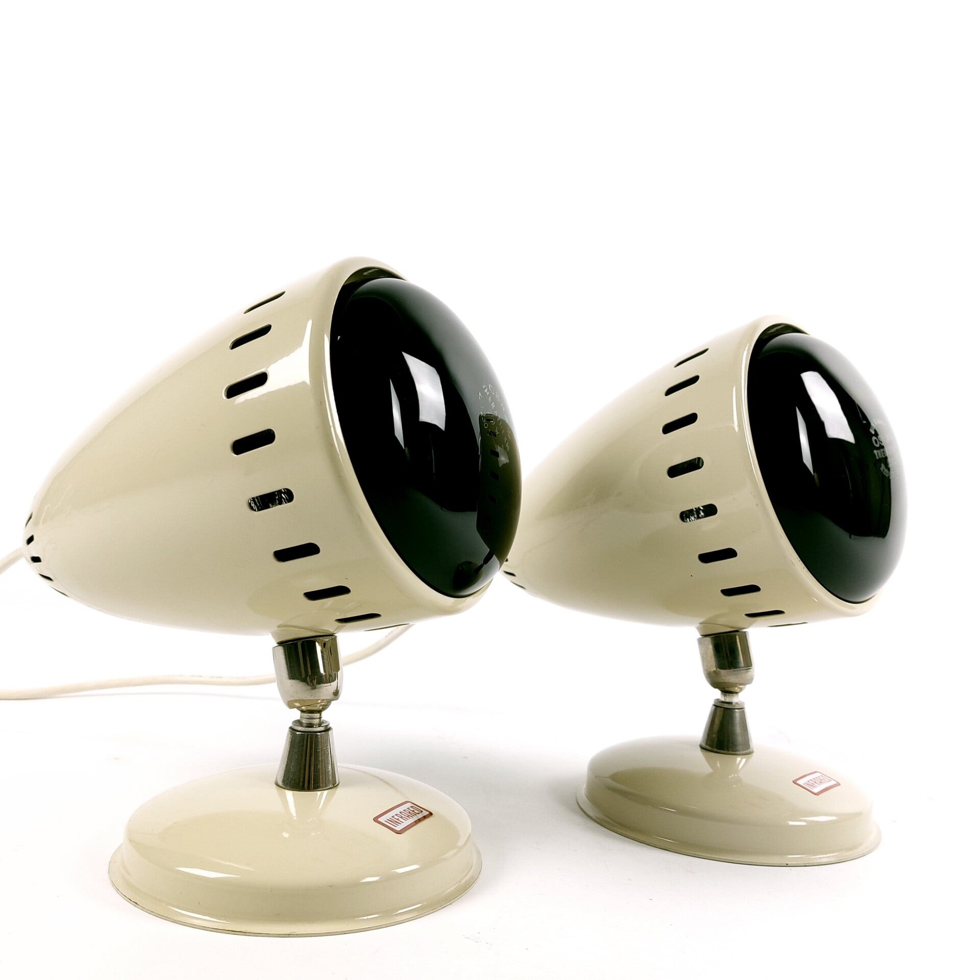 Zeldzame infraroodlampen uit de jaren '50 of '60 in zandkleurig metaal. Knap konisch ontwerp in space age stijl, deze eyecatchers lijken rechtstreeks uit een sci-fi film te komen. Door het kogelgewricht in de voet kunnen de lampen draaien en kantelen, en onderaan de voet is een haak voorzien waarmee ze ook opgehangen kunnen worden. Deze infraroodlampen werden gebruikt voor medische en therapeutische doeleinden. Beiden zijn in uitstekende vintage staat, met minieme ouderdomssporen. De lichtbron is inbegrepen.