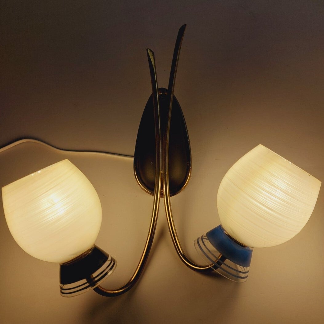 Mooie wandverlichting in rockabilly stijl uit de jaren '50 of '60. De dubbele wandlamp bestaat uit 2 kelken in gestreept mat glas met blauw en zwart gekleurde onderkanten, die verbonden zijn met het wandelement door sierlijke messing bogen. In heel goede staat, met lichte ouderdomssporen.