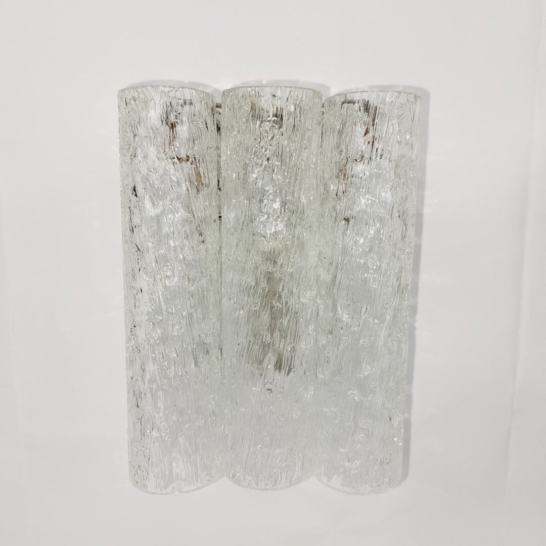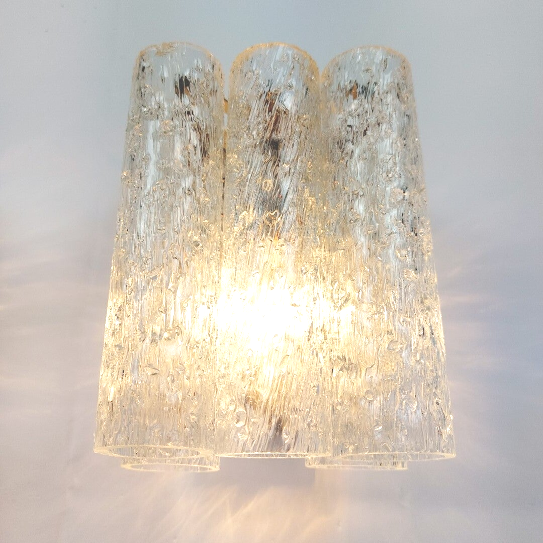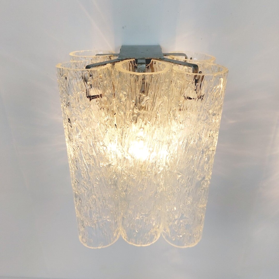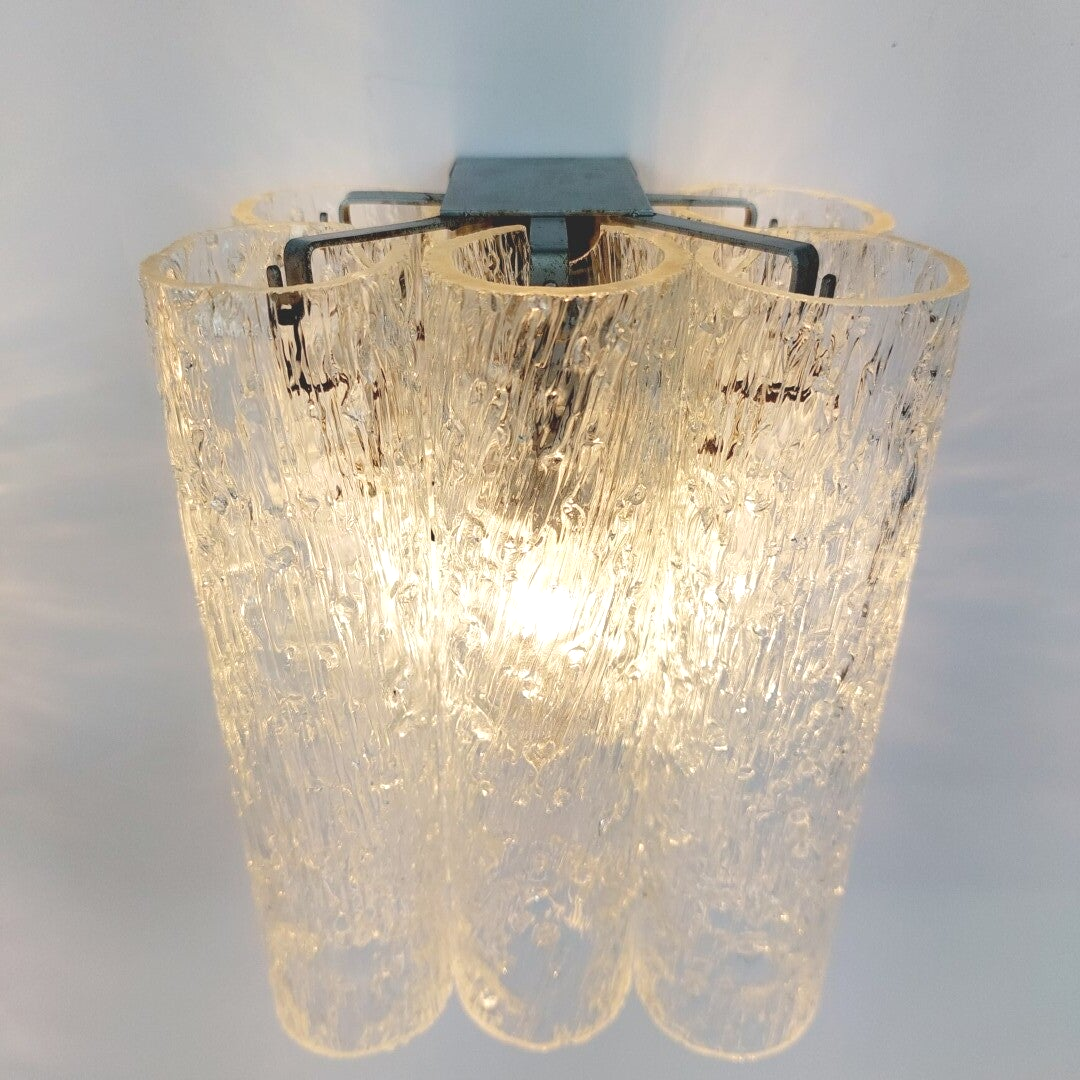 Mooie sfeervolle wandverlichting uit de jaren '60 van het Duitse Doria Leuchten. De wandlampen bestaan uit een metalen armatuur waar telkens 5 cilinders aan hangen in 'ijsglas' met een prachtige textuur in reliëf. De armaturen zijn in goede vintage staat met wat lichte roestvorming (maar dit is amper zichtbaar), en de glazen cilinders zijn allemaal in uitstekende staat, zonder schade.