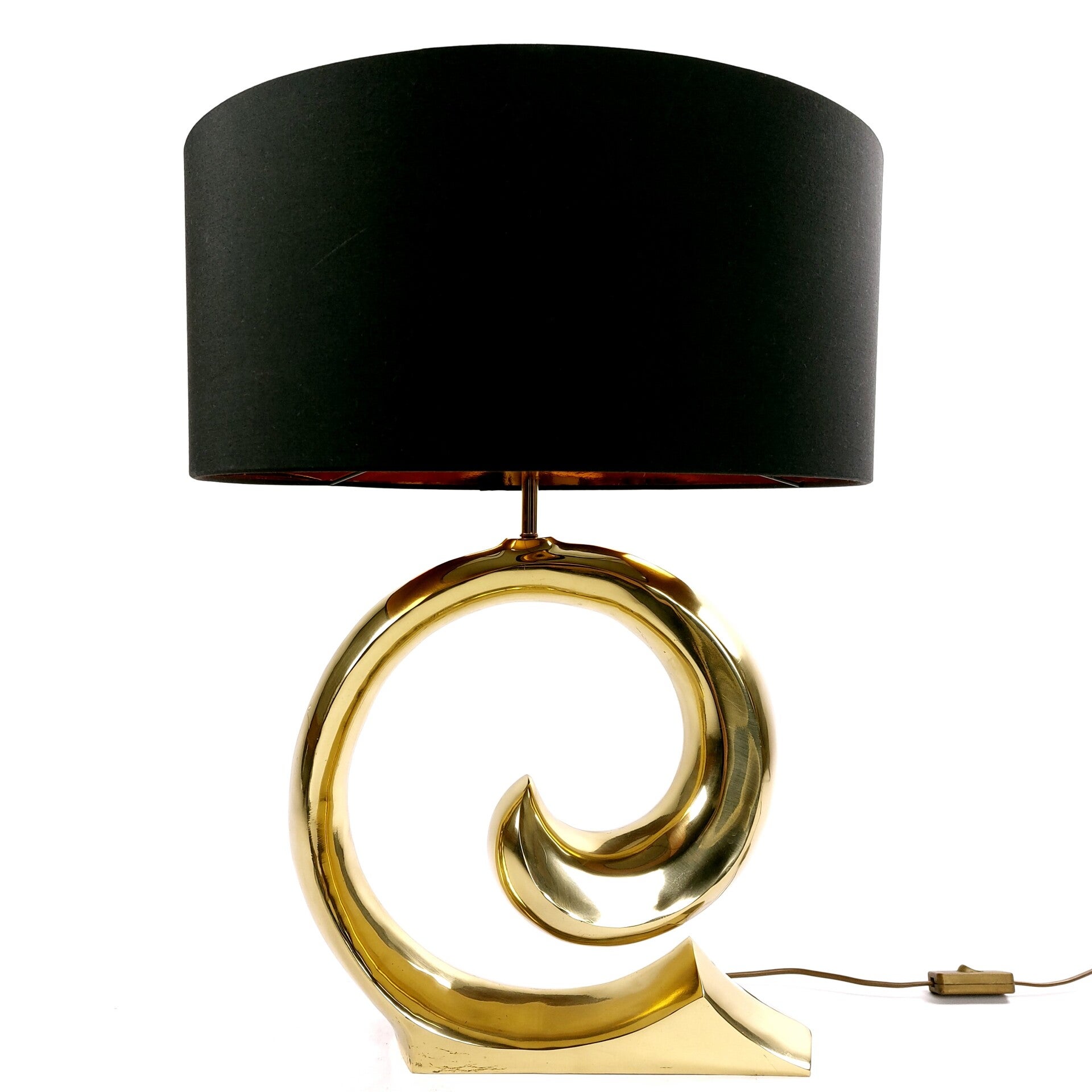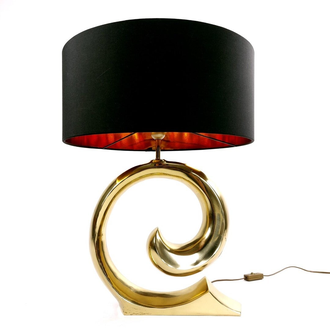 Deze magnifieke en weelderige tafellamp in Hollywood Regency stijl uit de jaren '70 wordt toegeschreven aan de Franse ontwerper Pierre Cardin. Het is een imposante en luxueuze blikvanger, met z'n prachtige golvend 'swoosh' design in messing en de mooie zwarte kap met koper/goudkleurige binnenkant. De lampvoet is in een heel goede vintage staat met enkele krasjes en milde ouderdomssporen, de kap is in uitstekende staat.