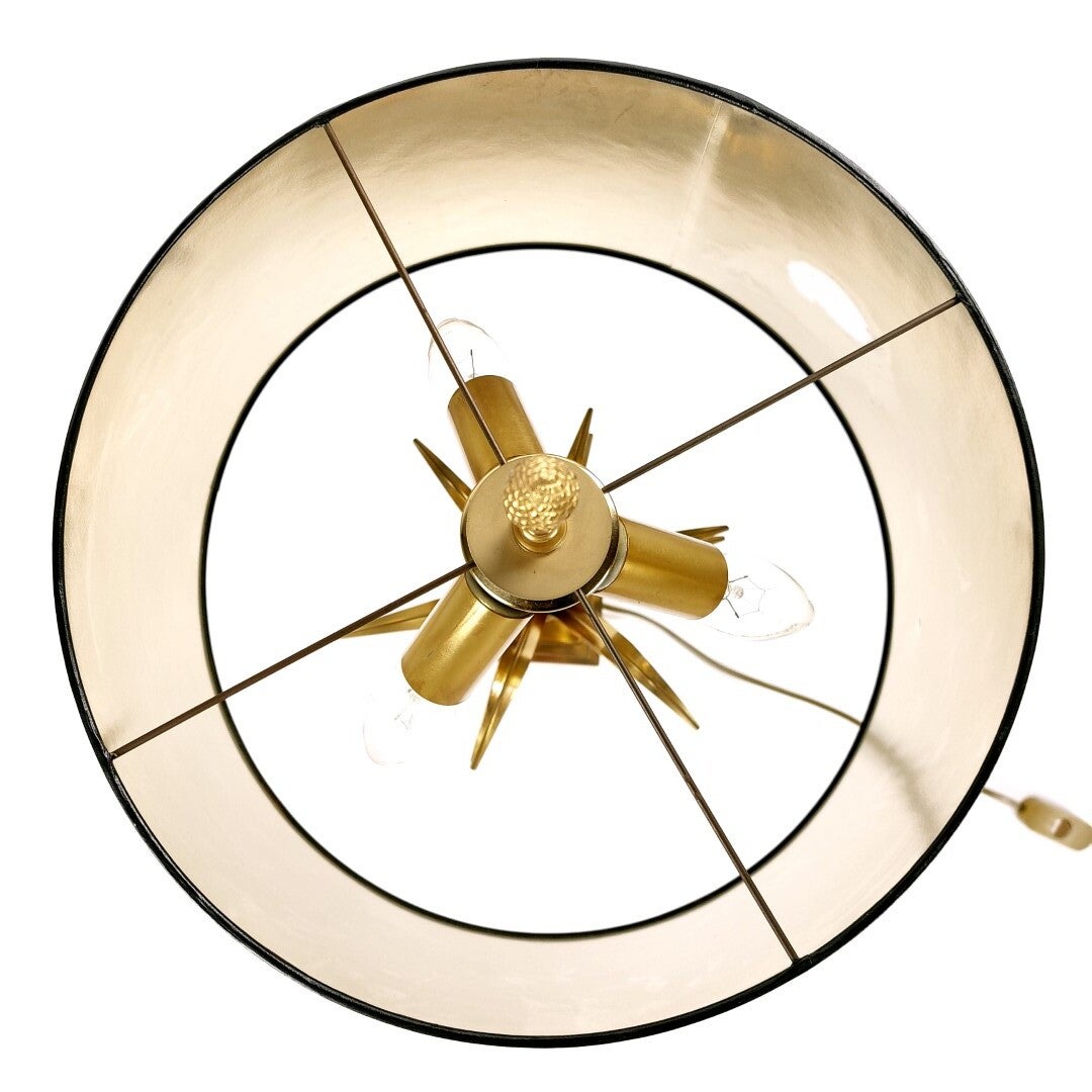 Deze mooie elegante tafellamp in Hollywood Regency stijl, ook wel palmlamp genoemd, werd geproduceerd door het Belgische S.A. Boulanger in de jaren '70. De weelderige lampvoet in messing en verguld metaal heeft 3 lichtpunten, en is in een uitstekende vintage staat. De lampenkap is nog origineel en is, afgezien van enkele lichte ouderdomssporen aan de goudkleurige binnenzijde, ook nog in heel goede staat.