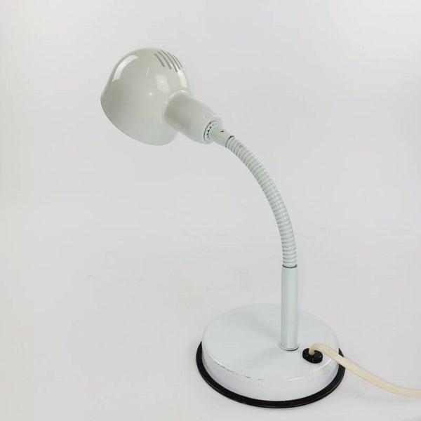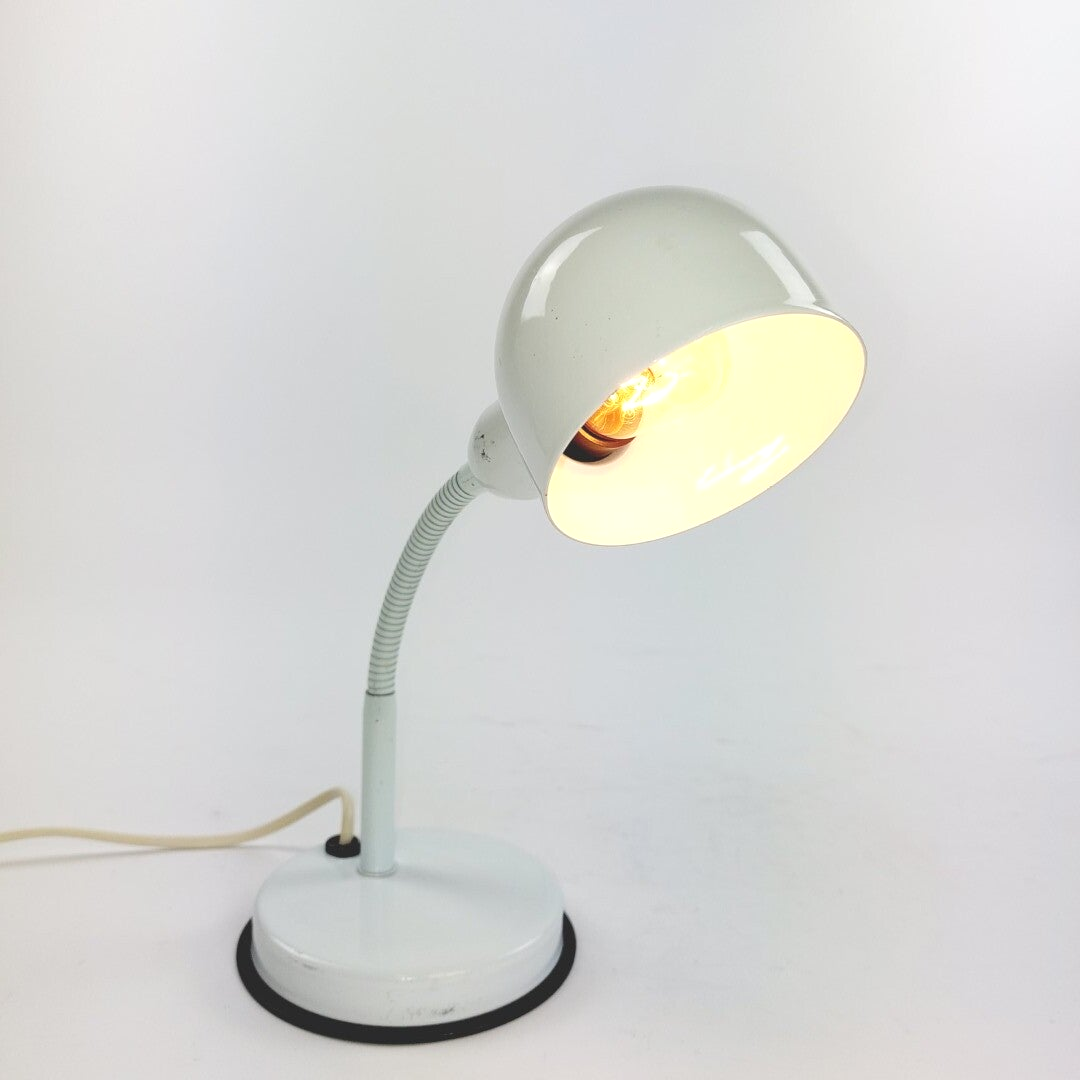 Knap bureaulampje uit de jaren '70 van het Italiaanse Nuova Veneta Lumi. Door de verstelbare gooseneck en kap kan de lamp in uiteenlopende posities gericht worden. De lamp is volledig afgewerkt in wit gelakt metaal, en is in een goede vintage staat, met gebruikssporen conform de leeftijd. Er is wat lakschade hier en daar, en een onopvallend licht deukje in de kap.